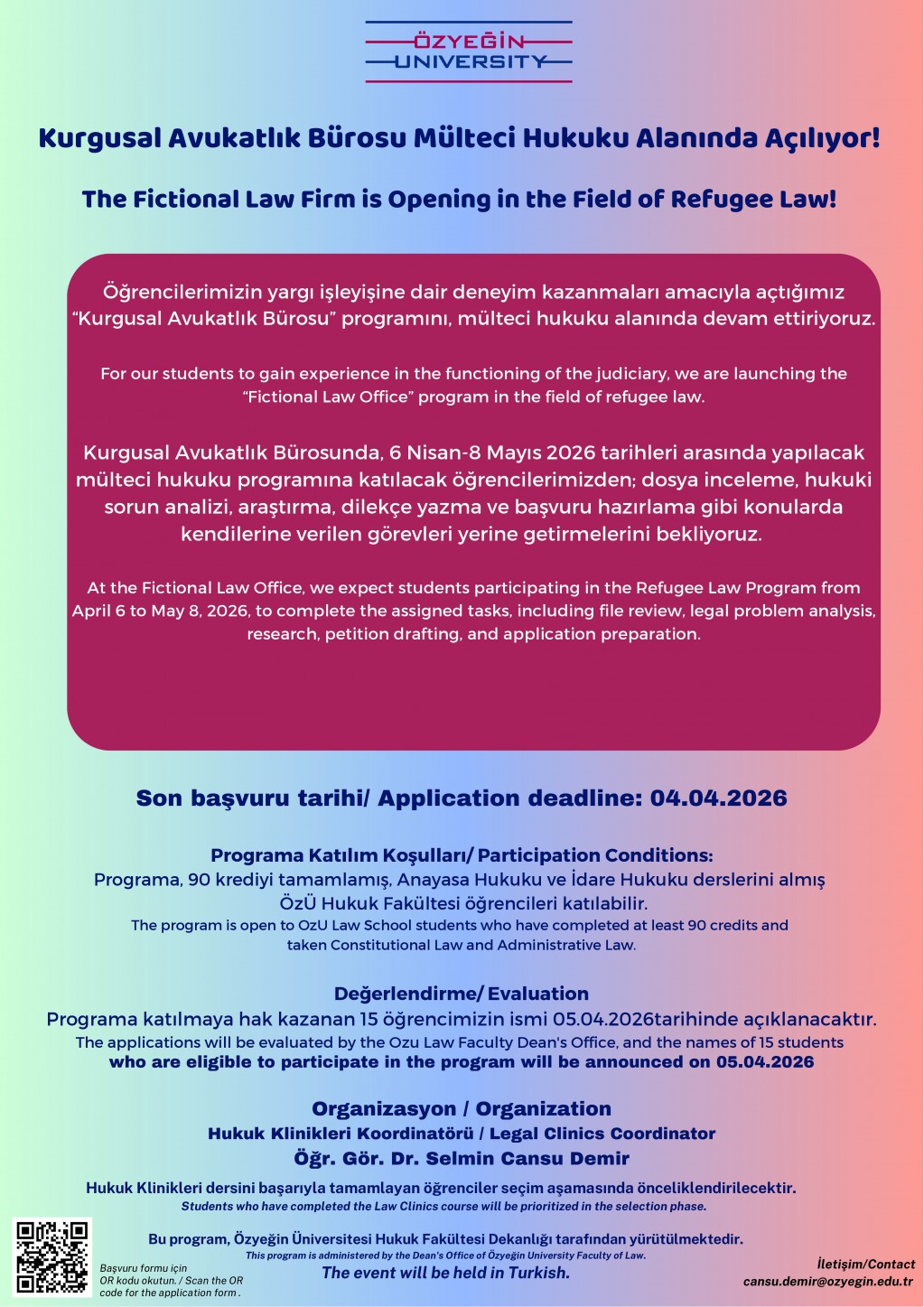 Students who will take part in the Mock Law Office in the field of Refugee Law are expected to attend the sessions to be held between April 6 – May 8, 2026, and to fulfill the tasks assigned to them within the scope of simulated cases conducted in the office, including: