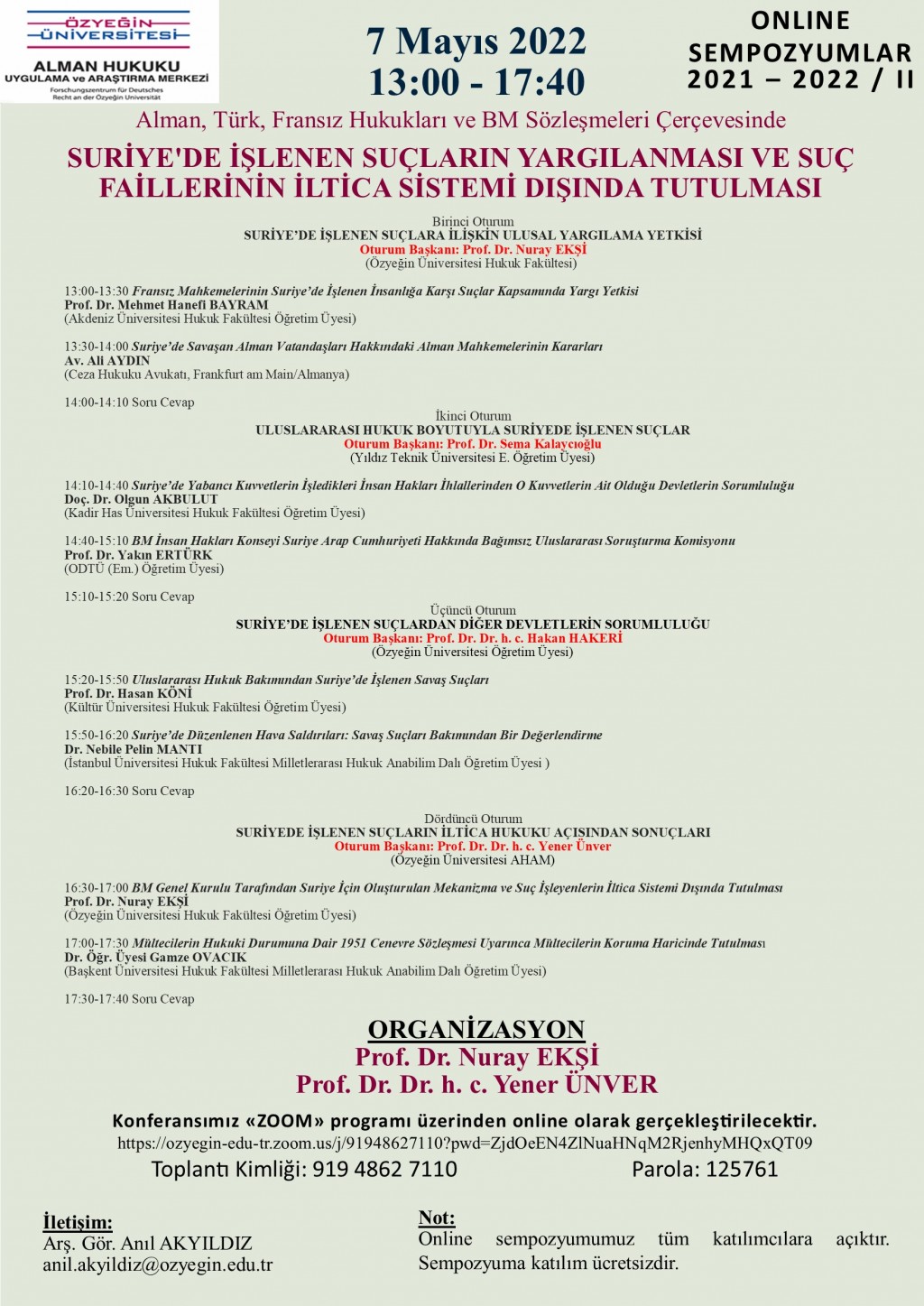 Symposium titled "Prosecution of Crimes Committed in Syria and Exclusion of Criminal Perpetrators from the Asylum System -within the Framework of German, Turkish, French Laws and UN Conventions" organized by Özyeğin University German Law Application and Research Center will be held on Saturday, May 7, from 13:00 through 17:40.