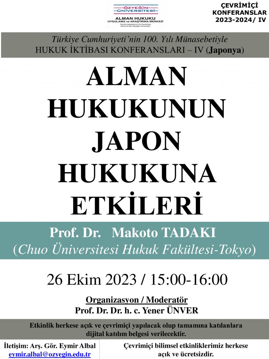 The conference titled "Effects of German Law on Japanese Law" organized by Özyeğin University German Law Application and Research Center will be held on Thursday, October 26, between 15:00 and 16:00.
