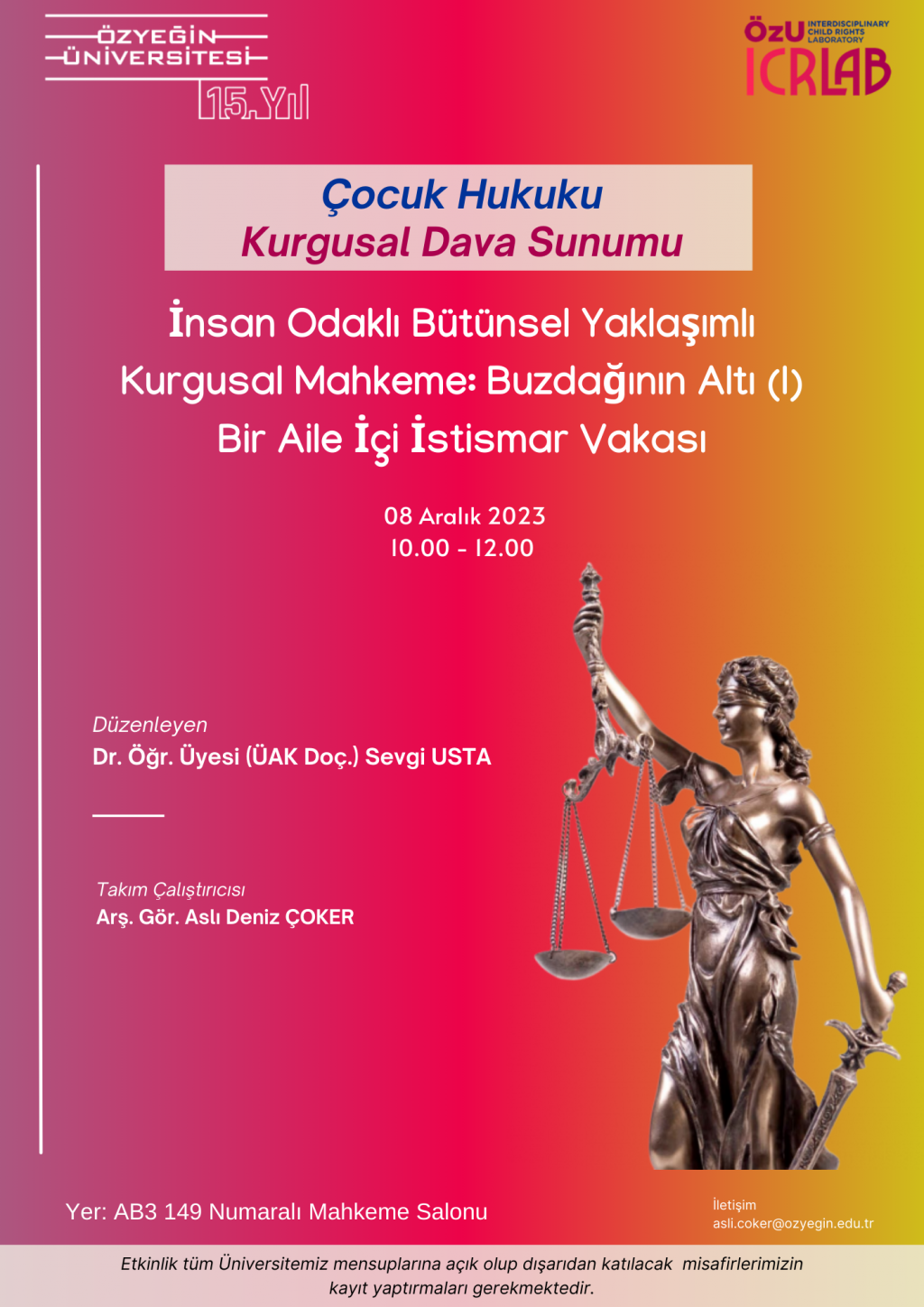 The Juvenile Law Fictional Case Presentation "Fictional Court with a Human-Oriented Holistic Approach: The Bottom of the Iceberg (I) A Domestic Abuse Case", organized by Özyeğin University Faculty of Law, will take place on Friday, December 8, 2023, between 10.00 - 12.00 in Courtroom numbered AB3 149.