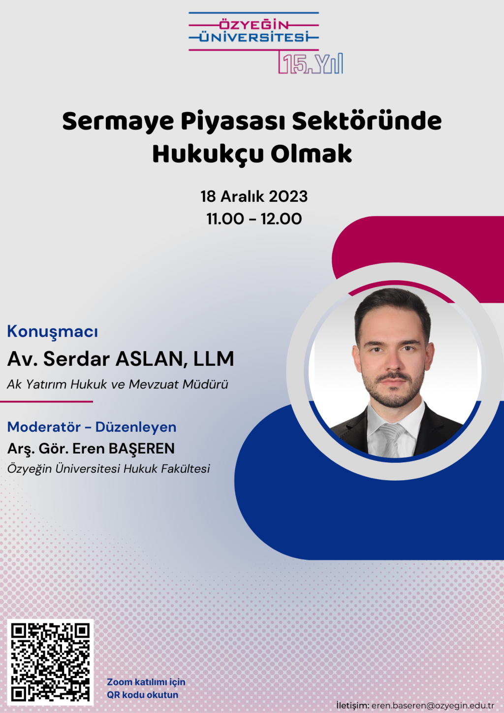 The talk titled "Being a Lawyer in the Capital Markets Sector" organized by Özyeğin University Faculty of Law will take place online via Zoom on Monday, December 18, 2023, between 11.00 - 12.00.