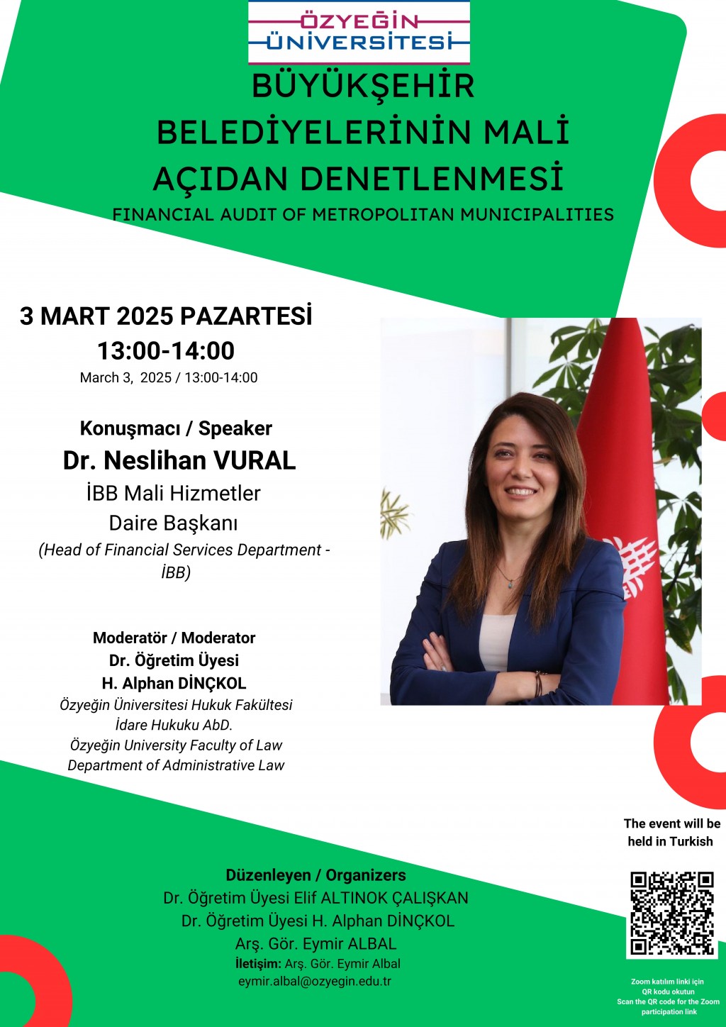 The event titled "Financial Audit of Metropolitan Municipalities" organized by Özyeğin University Faculty of Law will take place online via Zoom on Monday, March 3, 2025, between 13.00 - 14.00.