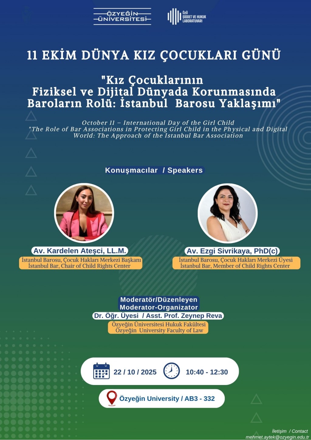 The event titled “The Role of Bar Associations in Protecting Girls in the Physical and Digital World: The Istanbul Bar Association’s Approach”, organized by Özyeğin University Faculty of Law within the scope of the International Day of the Girl Child (October 11), will be held face-to-face on Wednesday, October 22, 2025, between 10:40 and 12:30 in Room AB3. 332.