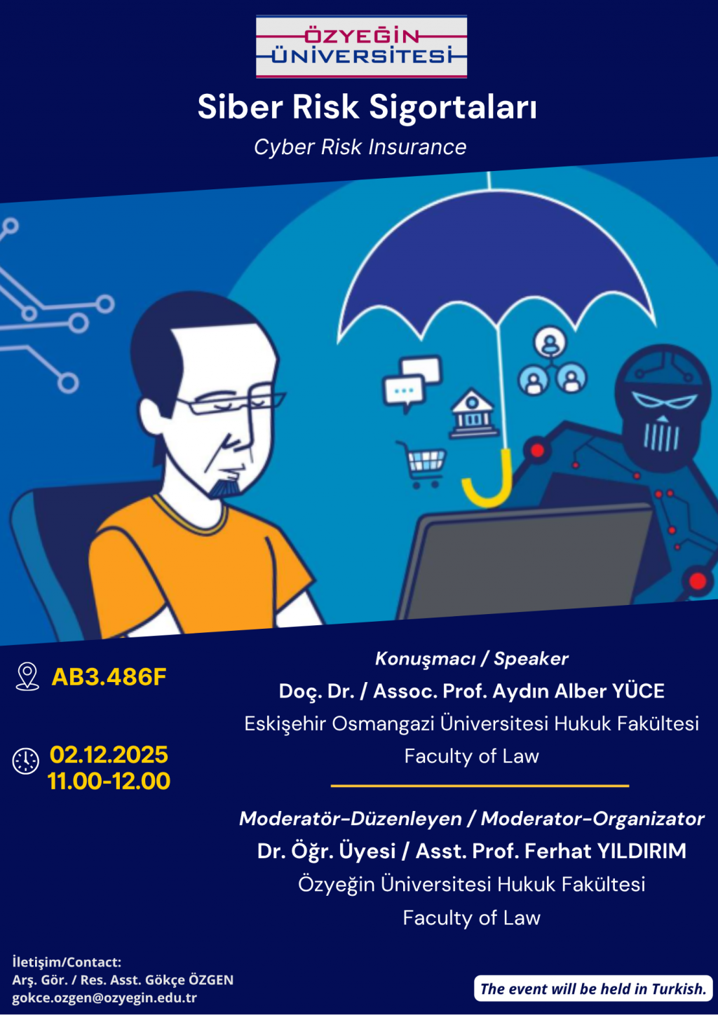 The event titled “Cyber Risk Insurance”, organized by the Faculty of Law at Özyeğin University, will be held face-to-face on Tuesday, December 2, 2025, between 11:00 and 12:00 in Room AB3. 486F.