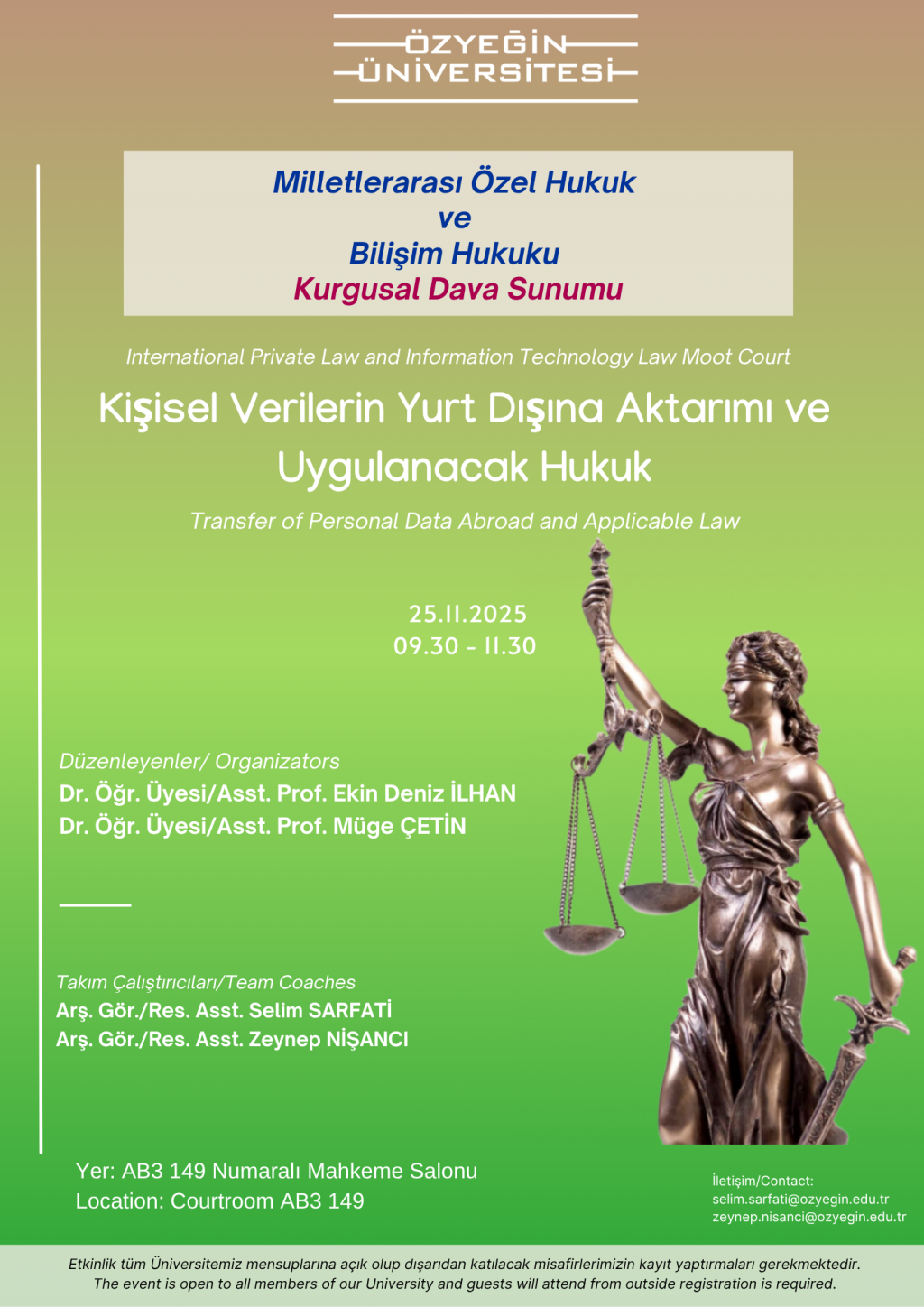 The Moot Court Presentation on “Cross-Border Transfer of Personal Data and Applicable Law” in the field of Private International Law and Information Technology Law, organized by Özyeğin University Faculty of Law, will be held in person on Tuesday, November 25, 2025, between 09:30 and 11:30, at the AB3 148-149 Courtroom.