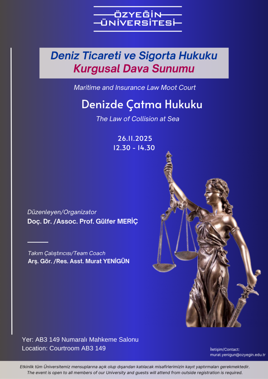The Moot Court Presentation on “Collision at Sea Law” in the field of Maritime and Insurance Law, organized by Özyeğin University Faculty of Law, will be held in person on Wednesday, November 26, 2025, between 12:30 and 14:30, at the AB3 148-149 Courtroom.