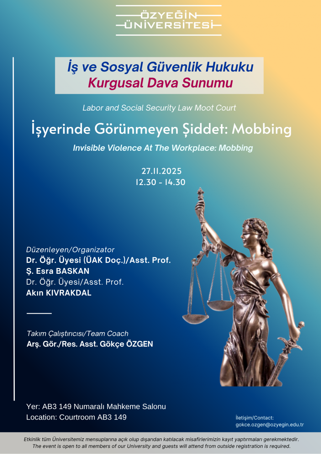 The Moot Court Presentation on “Invisible Workplace Violence: Mobbing” in the field of Labor and Social Security Law, organized by Özyeğin University Faculty of Law, will be held in person on Thursday, November 27, 2025, between 12:30 and 14:30, at the AB3 148-149 Courtroom.