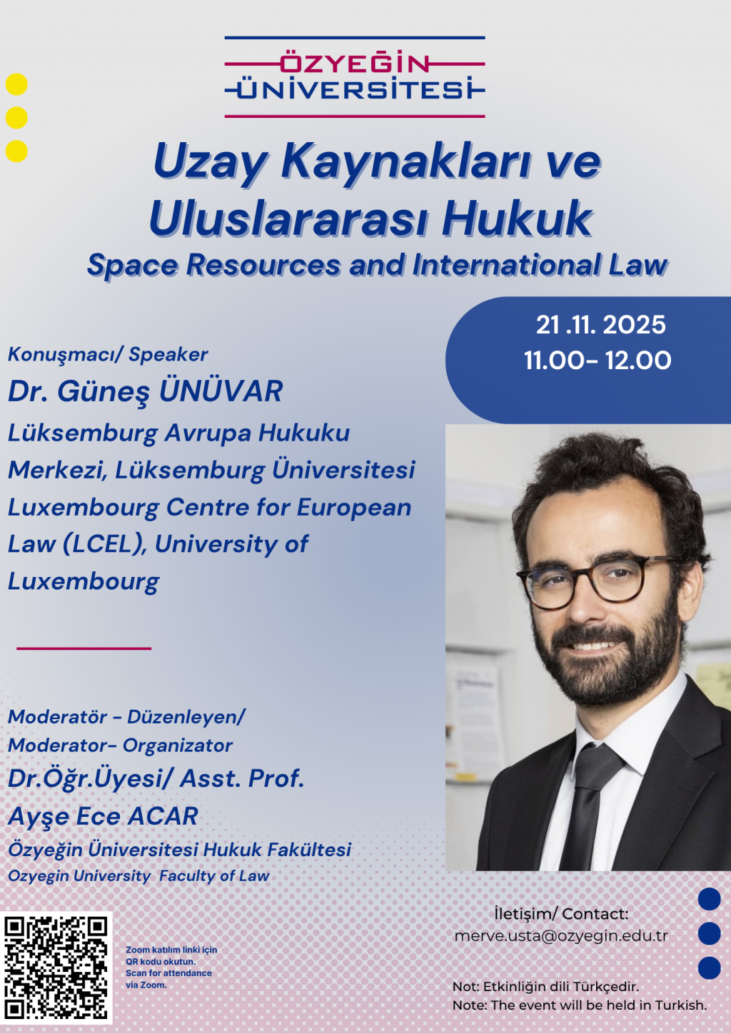 Organized by Özyeğin University Faculty of Law, the event titled ‘Space Resources and International Law’ will be held online via Zoom on Friday, November 21, 2025, between 11:00 and 12:00.