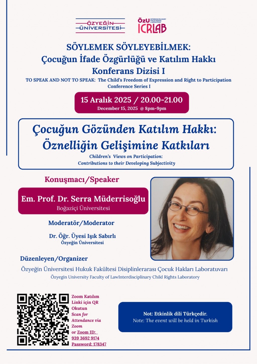 The event titled “Children's View on Participation: Contributions on their Developing Subjectivity” organized by Özyeğin University Faculty of Law and Interdisciplinary Research Laboratory on the Rights of the Child will be held online via Zoom on Monday, 15 December 2025, between 20:00 and 21:00.