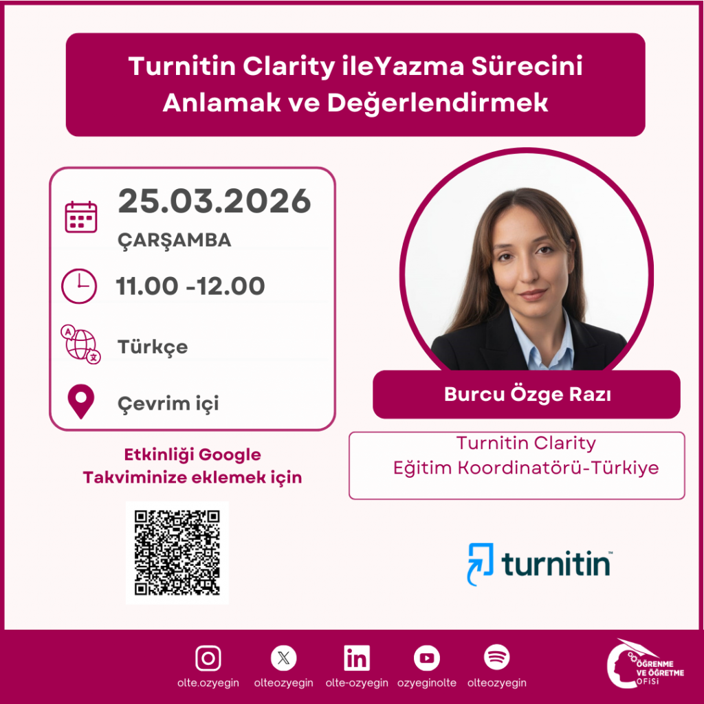 Üretken yapay zekâ (GenAI) araçlarının akademik çalışmalarda giderek daha yaygın hale gelmesiyle birlikte, öğrencilerimizin yazma süreçlerini anlamak ve akademik dürüstlüğü korumak her zamankinden daha önemli hale gelmiştir. Bu kapsamda, yalnızca nihai ödevi değil, yazma sürecinin tamamını görünür kılan yeni nesil akademik dürüstlük aracı Turnitin Clarity üzerine bir eğitim düzenliyoruz.