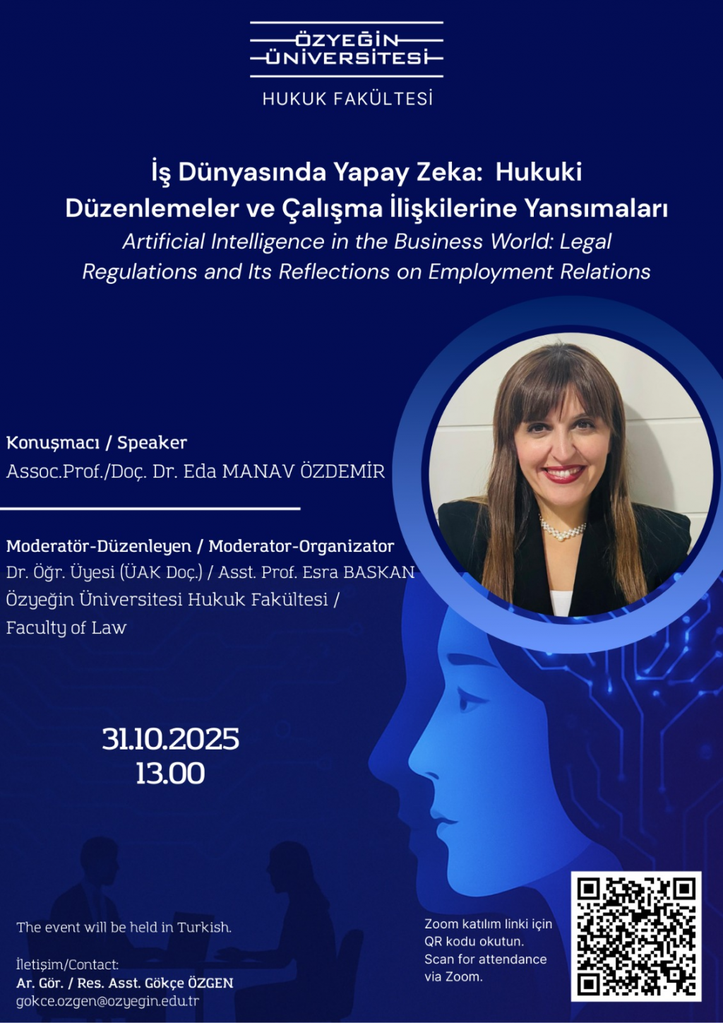 Özyeğin Üniversitesi Hukuk Fakültesi tarafından düzenlenen ''İş Dünyasında Yapay Zeka: Hukuki Düzenlemeler ve Çalışma İlişkilerine Yansımaları'' başlıklı etkinlik 31 Ekim 2025 Cuma günü saat 13.00-14.00 aralığında zoom üzerinden online olarak gerçekleşecektir.