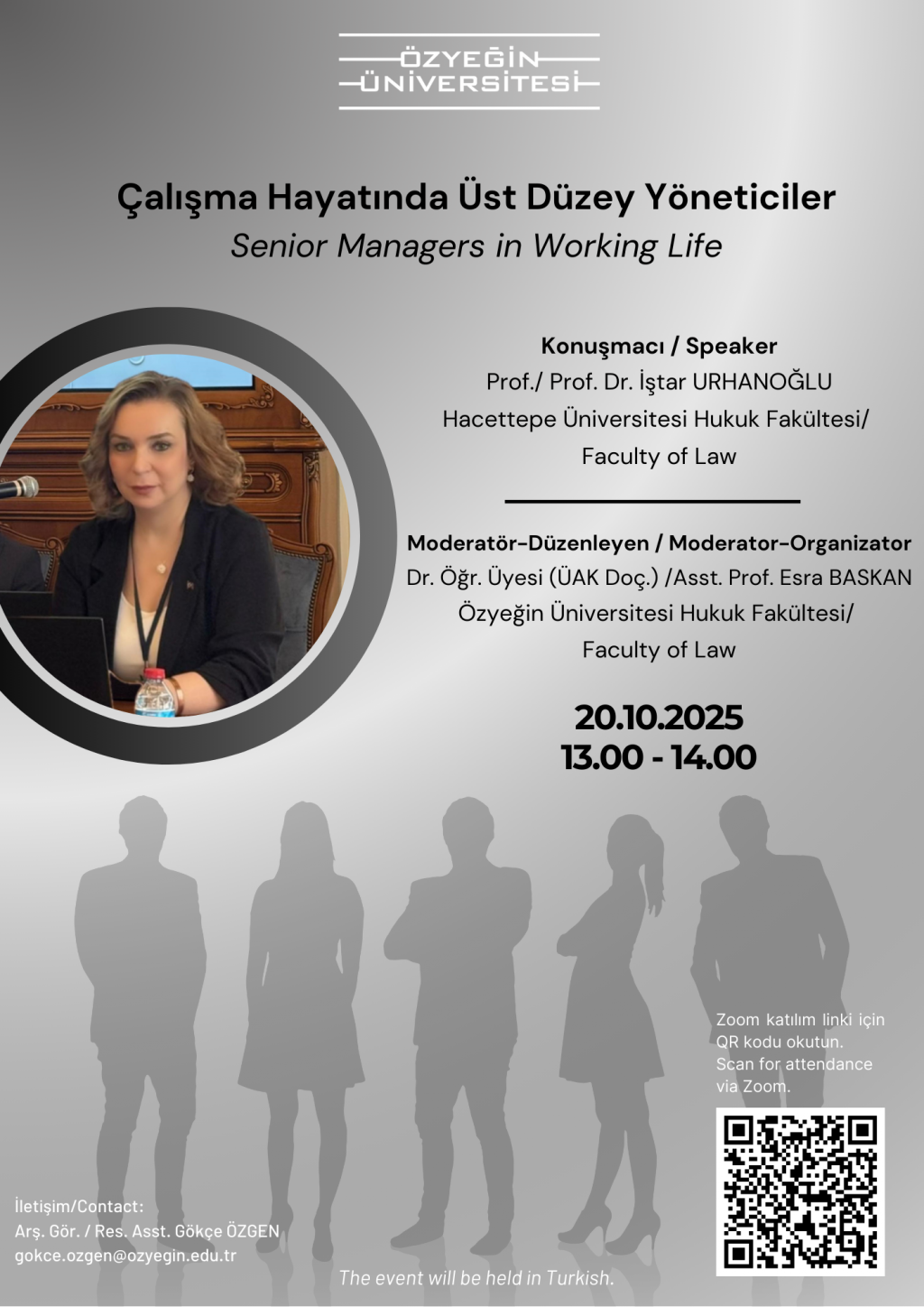 Özyeğin Üniversitesi Hukuk Fakültesi tarafından düzenlenen ''Çalışma Hayatında Üst Düzey Yöneticiler'' başlıklı etkinlik 20 Ekim 2025 Pazartesi günü saat 13.00-14.00 aralığında zoom üzerinden online olarak gerçekleşecektir.