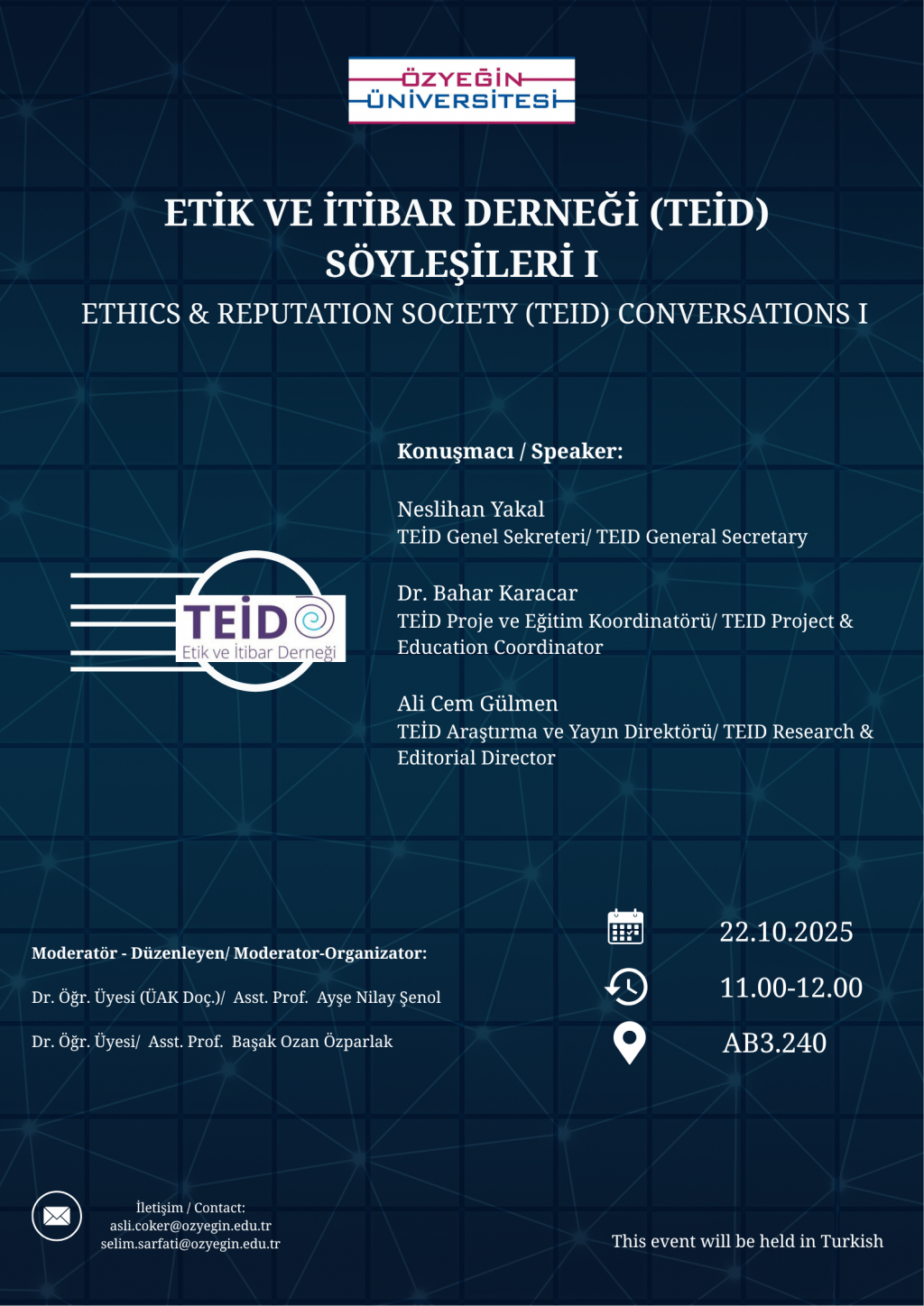 Özyeğin Üniversitesi Hukuk Fakültesi tarafından Etik ve İtibar Derneği (TEİD) işbirliği ile düzenlenen ''Etik ve İtibar Derneği (TEİD) Söyleşileri I'' adlı etkinlik 22 Ekim 2025 Çarşamba günü saat 11.00-12.00 aralığında AB3. 240 numaralı salonda yüz yüze gerçekleştirilecektir.