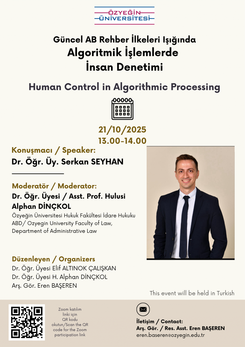 Özyeğin Üniversitesi Hukuk Fakültesi tarafından "Güncel AB Rehber İlkeleri Işığında Algoritmik İşlemlerde İnsan Denetimi" adlı etkinlik 21 Ekim 2025 Salı günü saat 13.00-14.00 aralığında zoom üzerinden online olarak gerçekleşecektir.