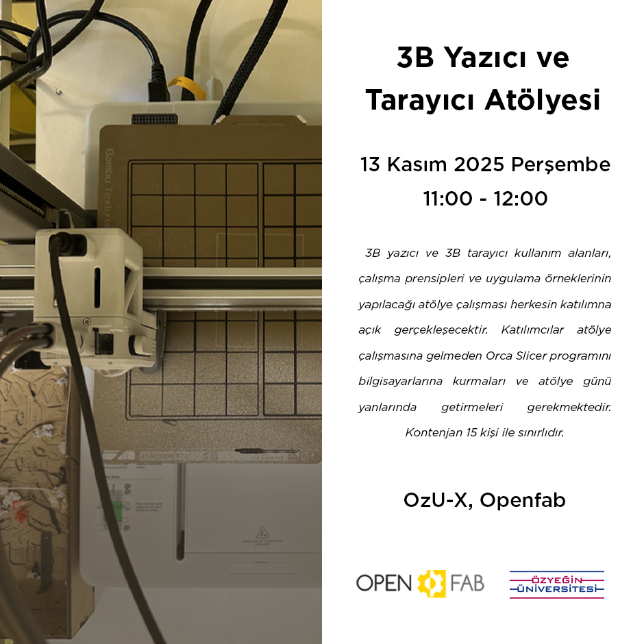 3B yazıcı ve 3B tarayıcı kullanım alanları, çalışma prensipleri ve uygulama örneklerinin yapılacağı atölye çalışması herkesin katılımına açık gerçekleşecektir. Katılımcılar atölye çalışmasına gelmeden Orca Slicer programını bilgisayarlarına kurmaları ve atölye günü yanlarında getirmeleri gerekmektedir. Kontenjan sınırlıdır. Atölyeye kayıt olmak için formu doldurmayı unutmayınız.
