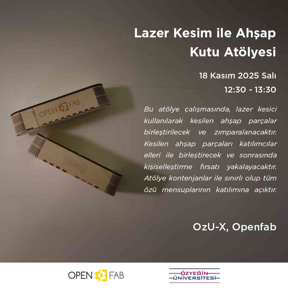 Bu atölye çalışmasında, lazer kesici kullanılarak kesilen ahşap parçalar birleştirilecek ve zımparalanacaktır. Kesilen ahşap parçaları katılımcılar elleri ile birleştirecek ve sonrasında kişiselleştirme fırsatı yakalayacaktır. Atölye kontenjanlar ile sınırlı olup tüm ÖzÜ mensuplarının katılımına açıktır. Kayıt için başvuru formunu doldurmayı unutmayınız. Sorularınız için openfab@ozyegin.edu.tr adresinden bizimle iletişime geçebilirsiniz.