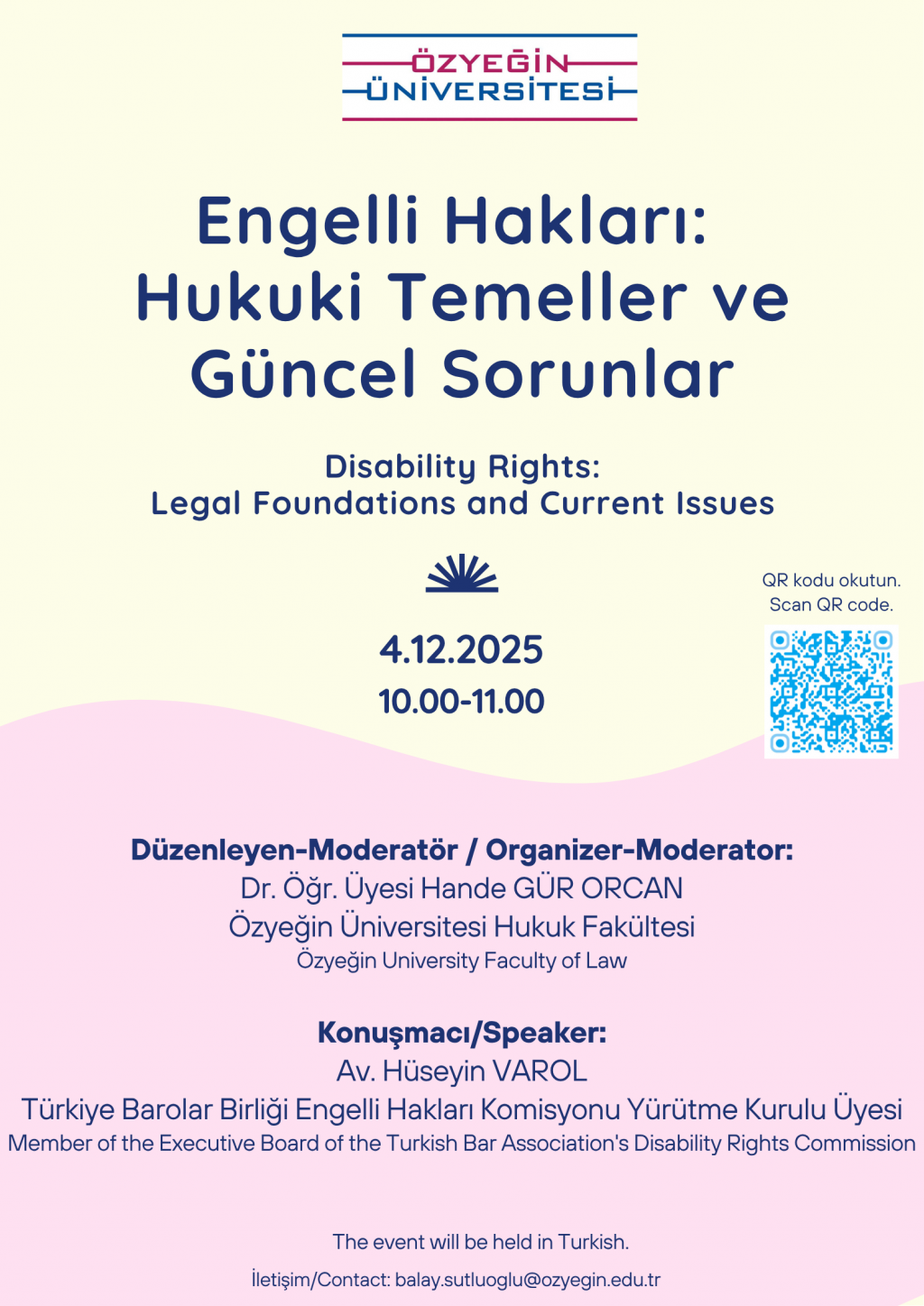 Özyeğin Üniversitesi Hukuk Fakültesi tarafından düzenlenen ''Engelli Hakları: Hukuki Temeller ve Güncel Sorunlar” adlı etkinlik 4 Aralık 2025 Perşembe günü saat 10.00-11.00 aralığında zoom üzerinden online olarak gerçekleşecektir.