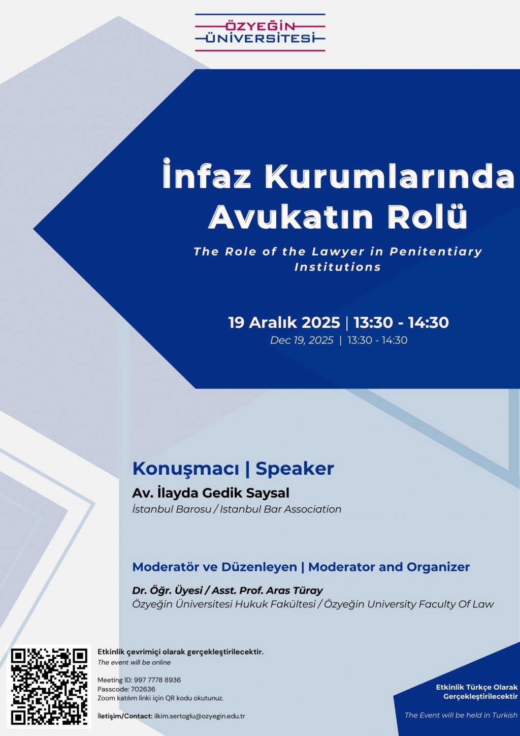 Özyeğin Üniversitesi Hukuk Fakültesi tarafından düzenlenen ''İnfaz Kurumlarında Avukatın Rolü" adlı etkinlik 19 Aralık 2025 Cuma günü saat 13.30-14.30 aralığında zoom üzerinden online olarak gerçekleşecektir.